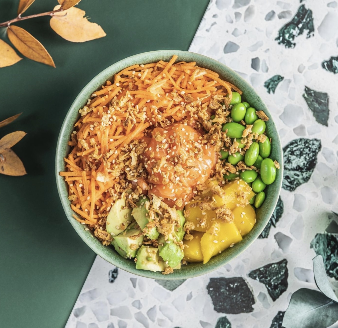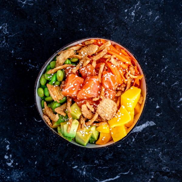Saumon mariné au soja, edamame, avocat, mangue, carottes, oignons frits, sésame , sauce soja Heiko