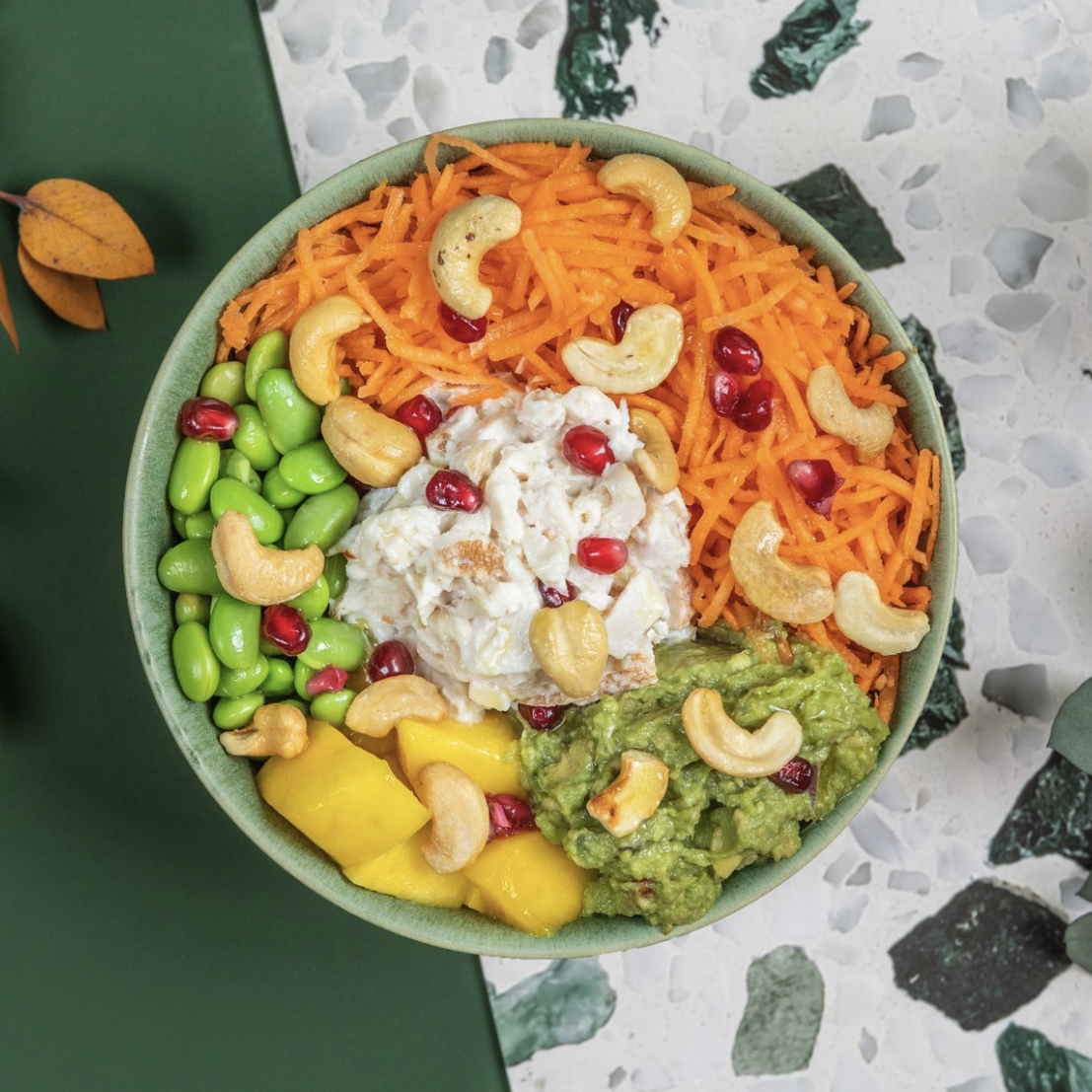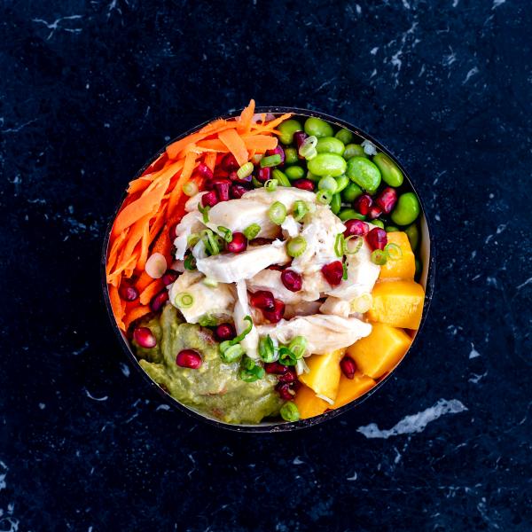 Poulet mariné au citron, mangue, guacamole, carottes, edamame, grenade, noix de cajou, cebettes, vinaigrette mizo citro…