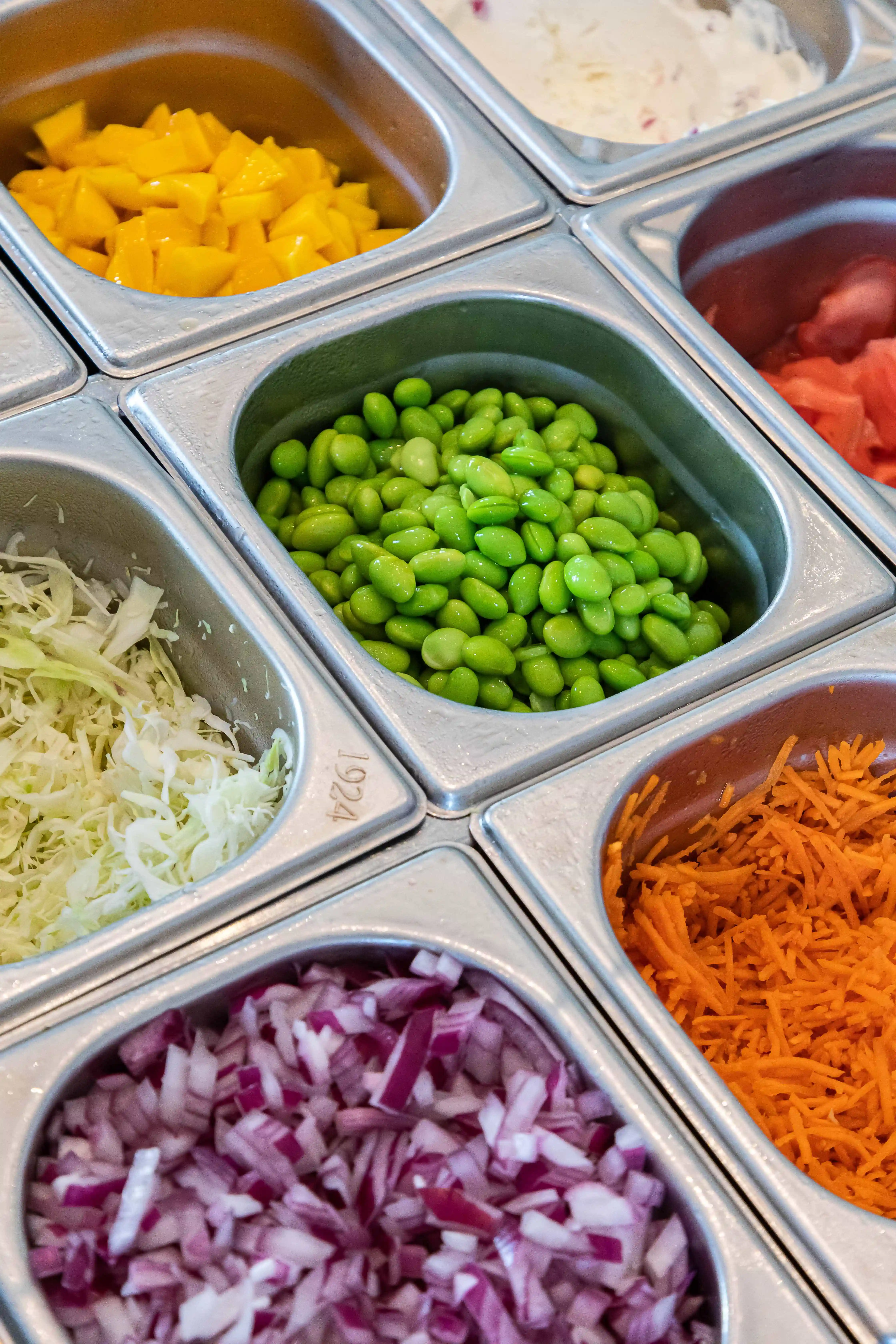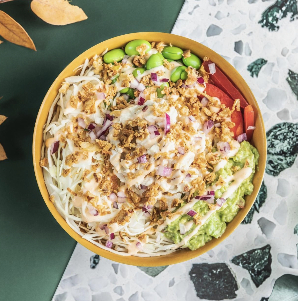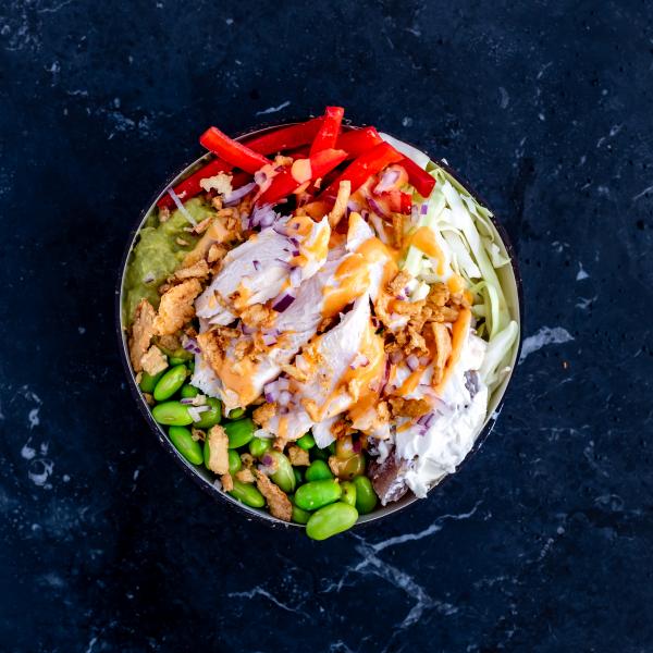 Poulet mariné, cream cheese thon cuit, poivrons, edamame, choux, guacamole, oignons rouges, oignons frit, spicy mayonna…