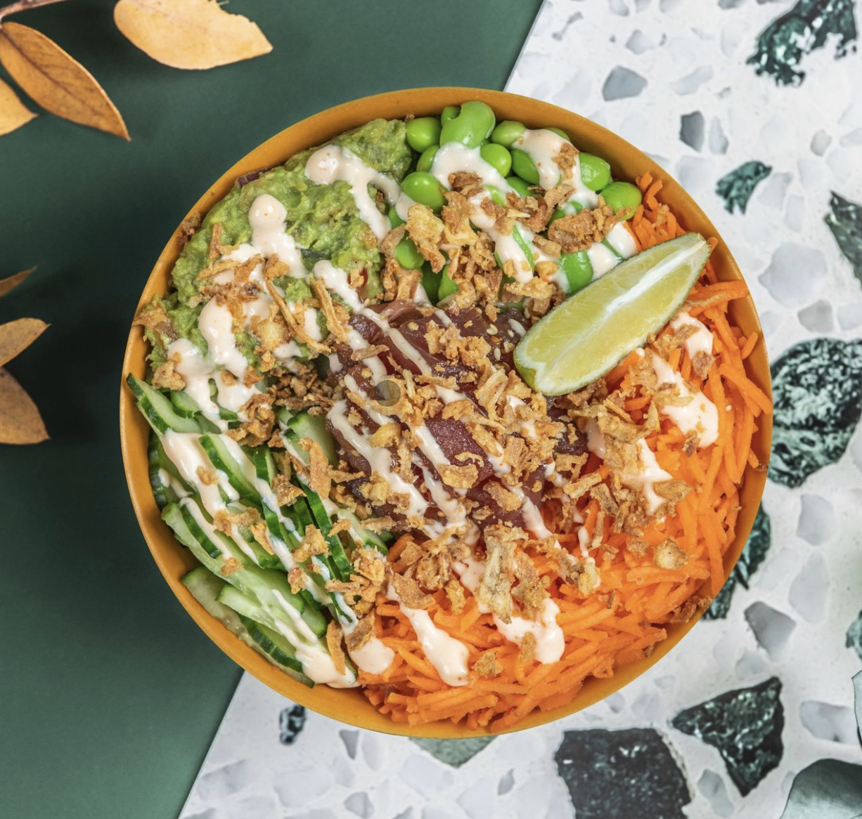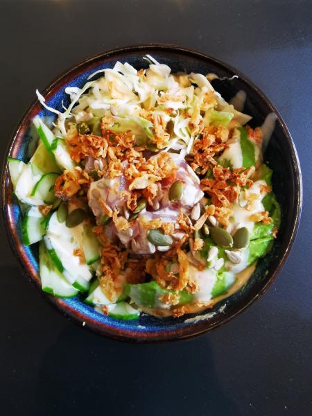 Thon mariné, carottes, guacamole, edamame, concombre, oignons frit, oignons rouge, mayonnaise épicée