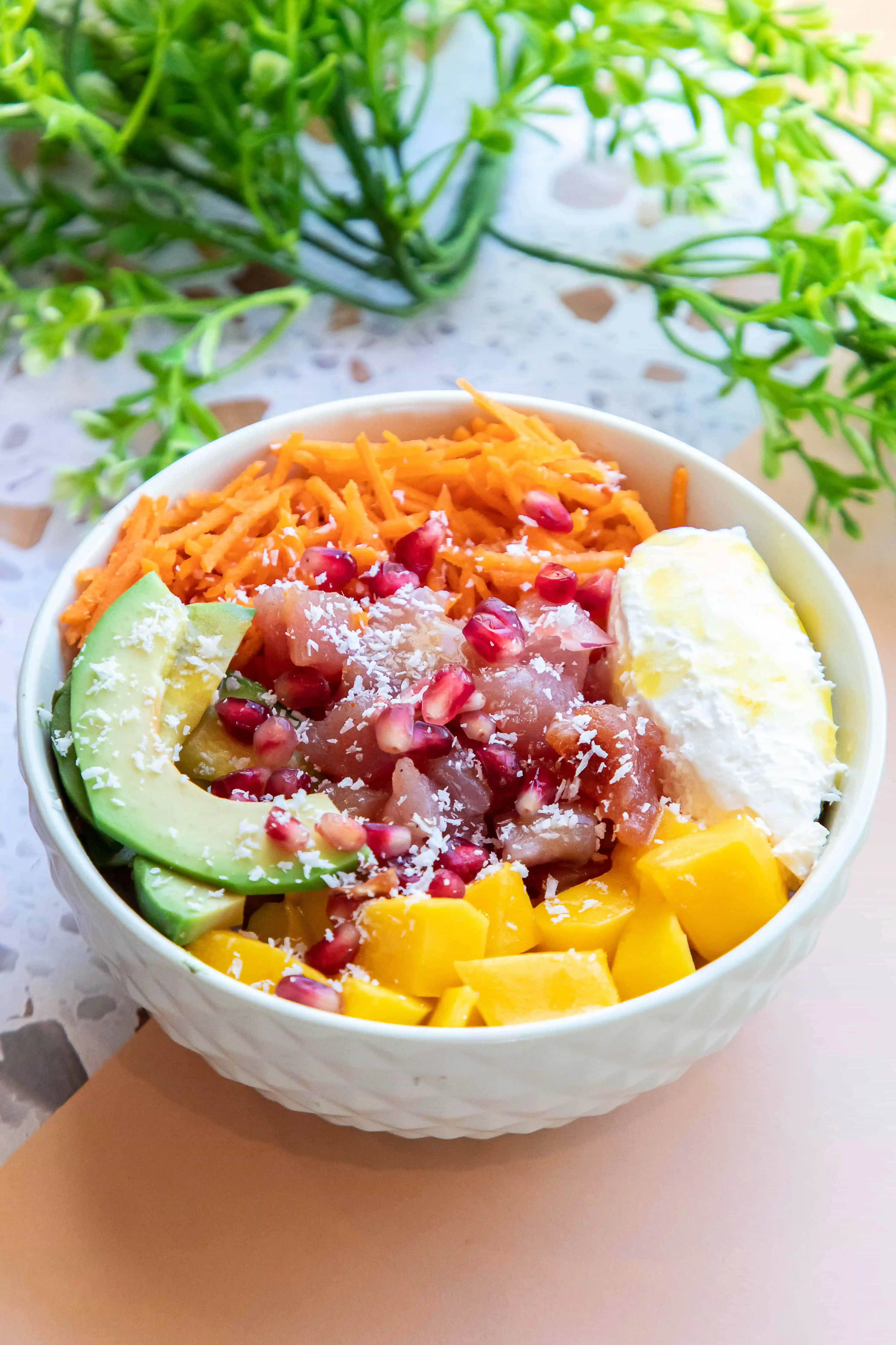 Thon mariné, carottes, avocat, cream cheese citron, mangue, coco râpée, grenade, sauce tropical