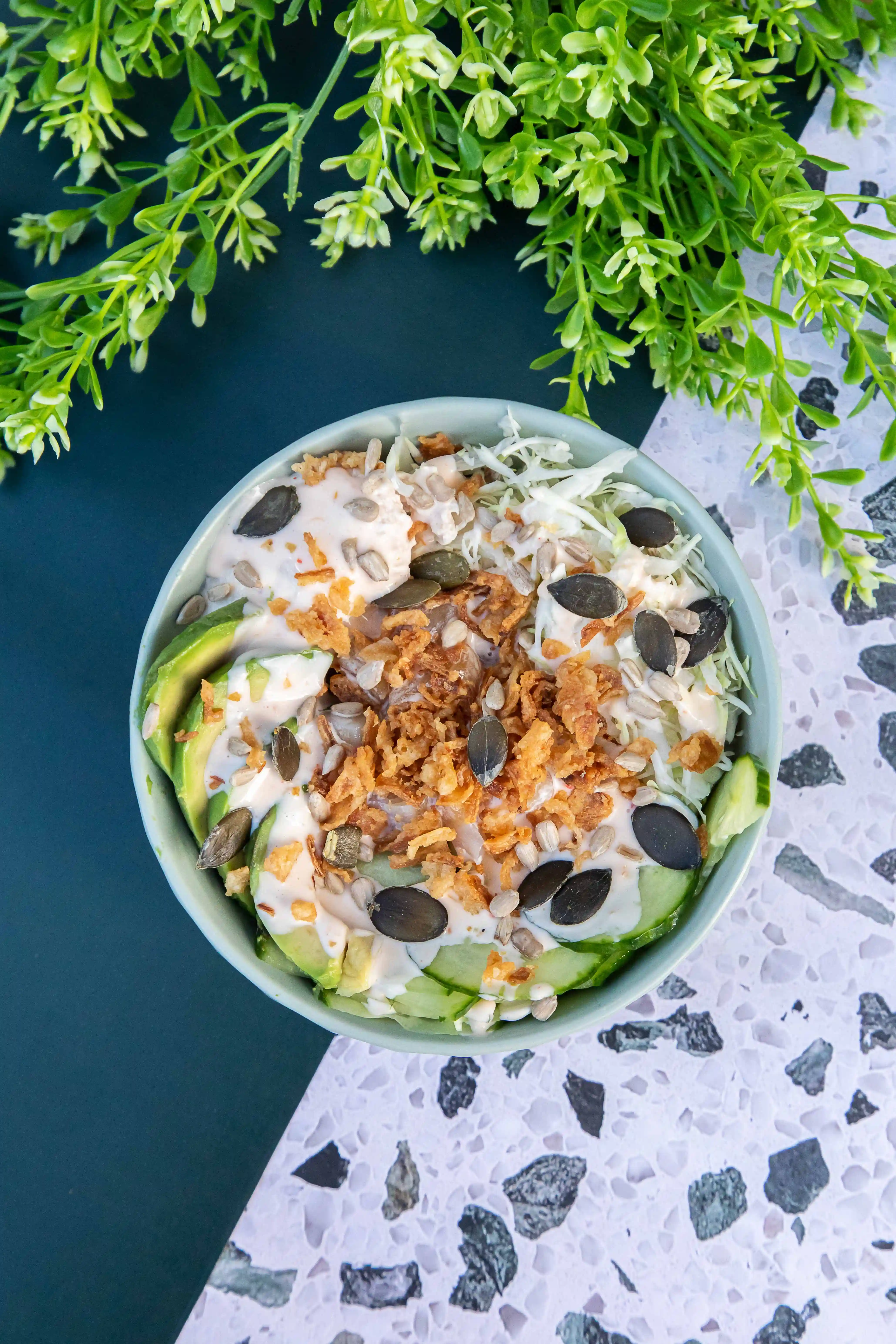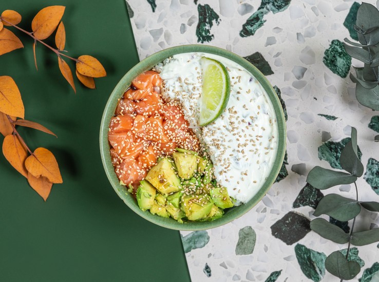 Saumon mariné au soja, salade de choux, concombre, avocat, cream cheese citronée, cebette, grenade, sésame, vinaigrette…