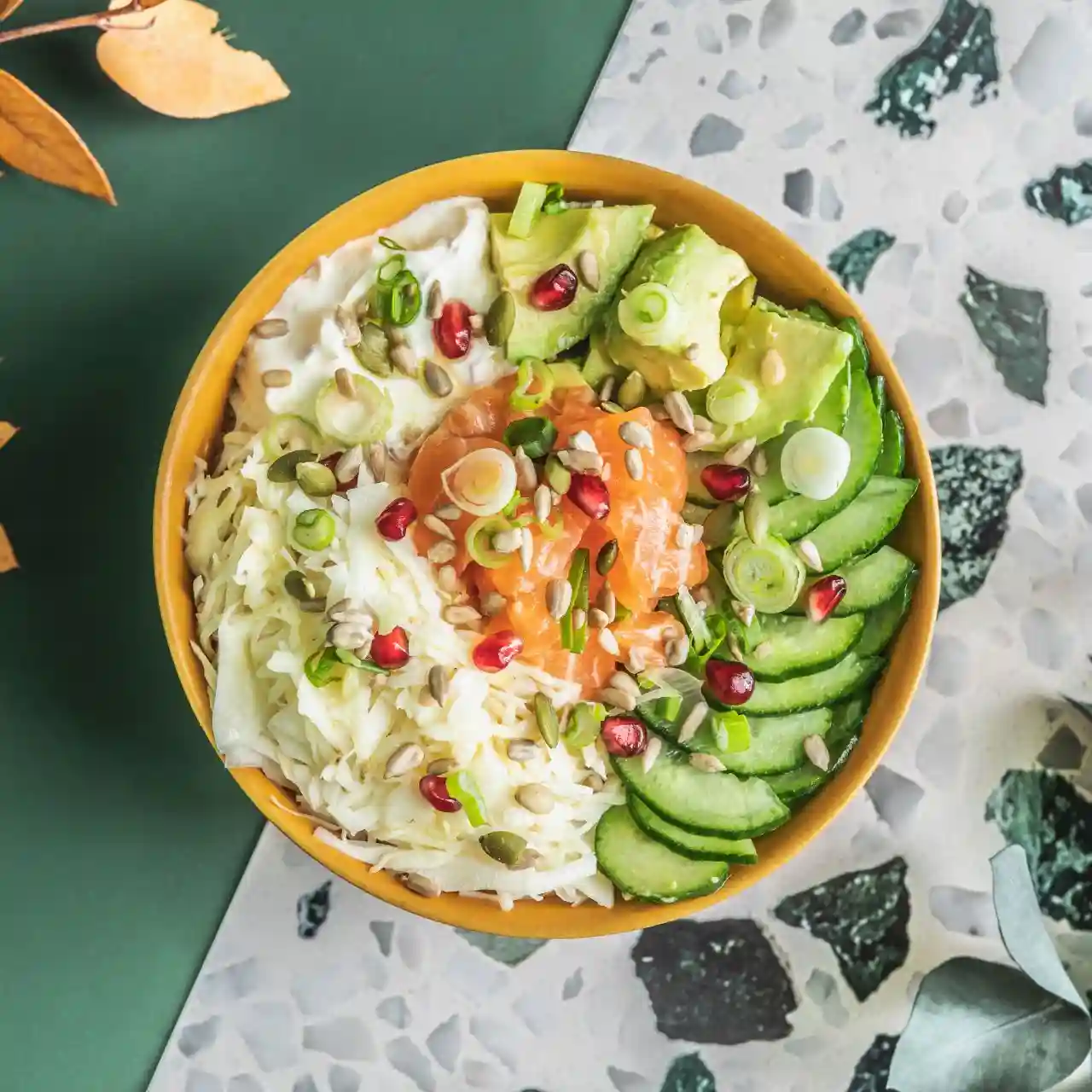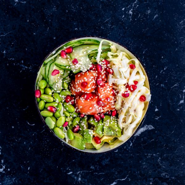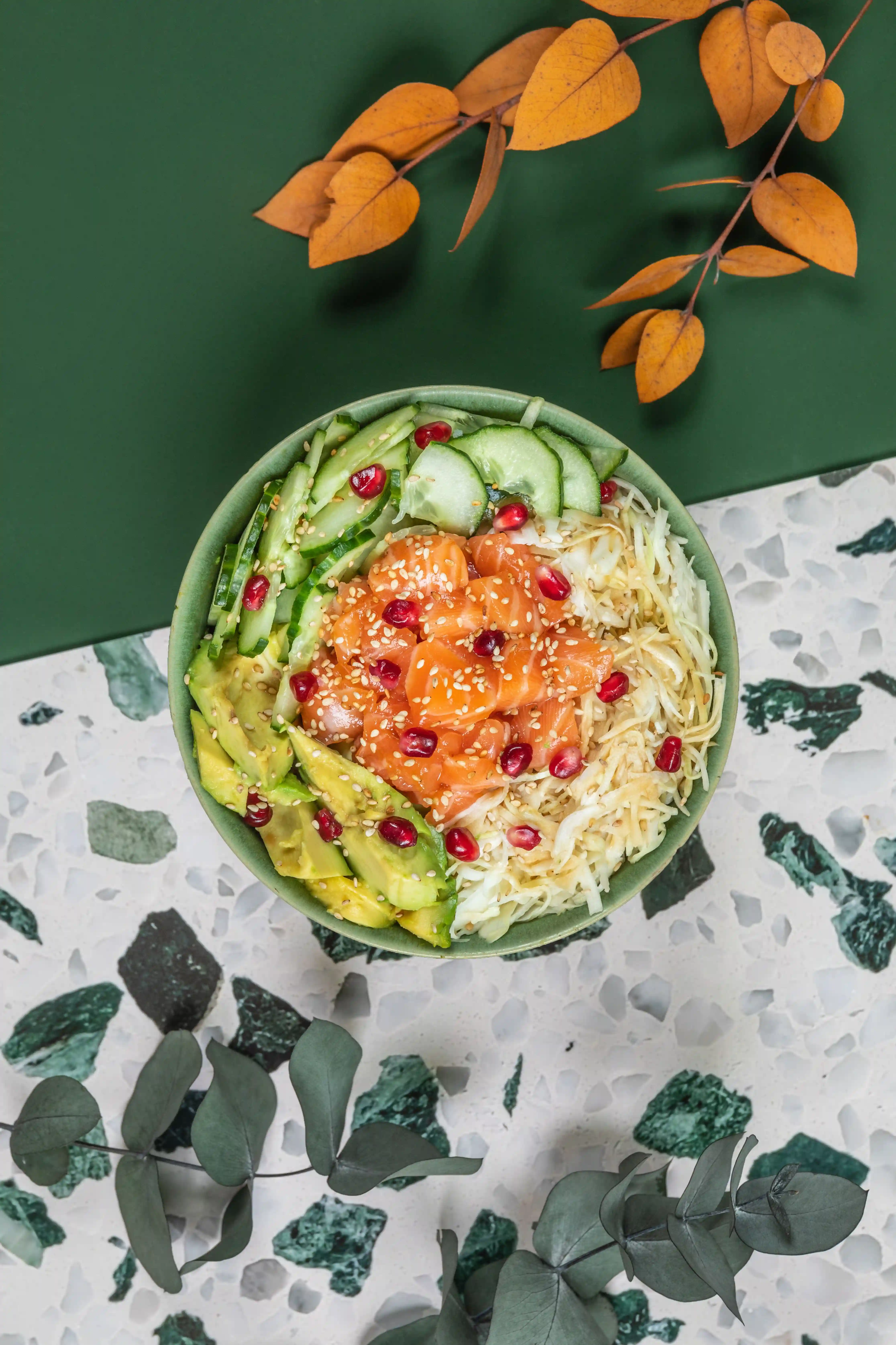 Saumon, salade de chou, concombre, avocat, sésame, grenade, sauce soja Heiko