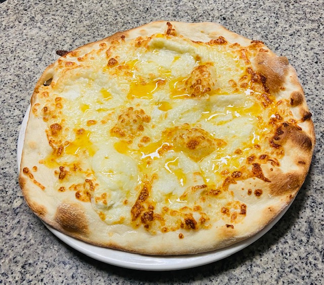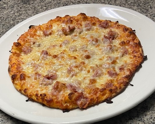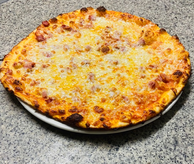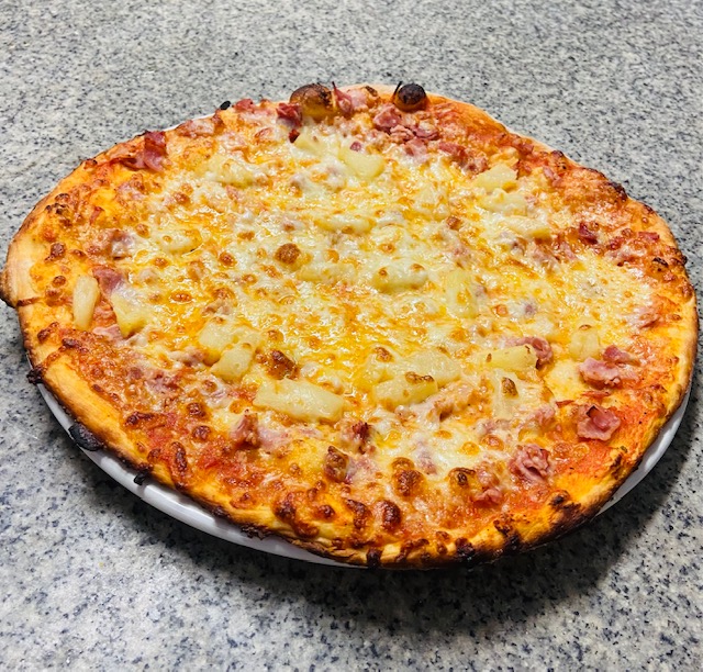 Sauce tomate, jambon torchon, ananas, crème fraîche, mozzarella