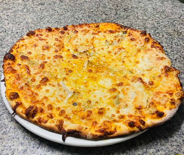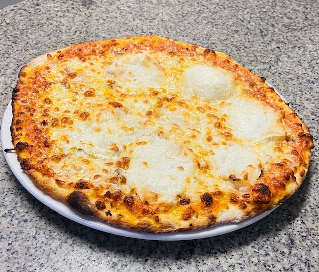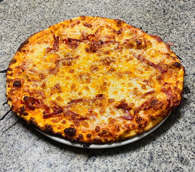 Sauce tomate, lardons, chèvre, crème fraiche, mozzarella