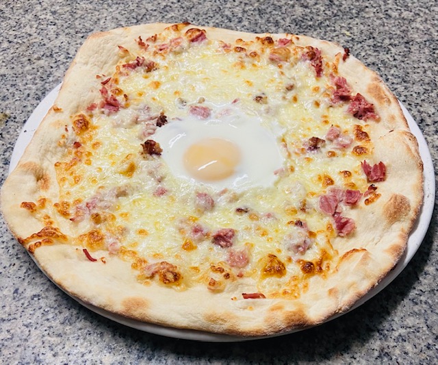Crème fraiche, lardons, jambon torchon, œuf, mozzarella