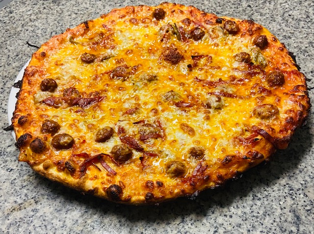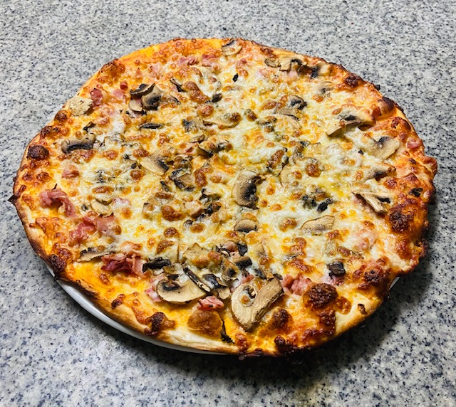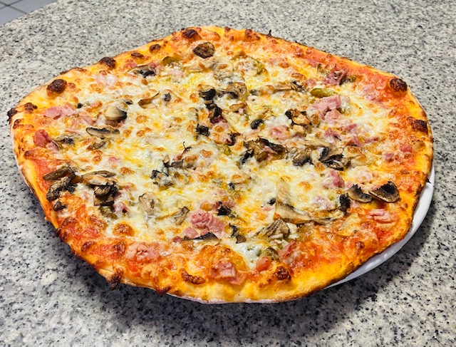 Sauce tomate, oignons, poivrons, jambon torchon, champignons frais, mozzarella