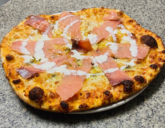 Sauce tomate, saumon fumé, ail, basilic, mozzarella
