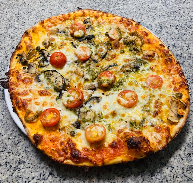 Sauce tomate, oignons, poivrons, champignons frais, tomates cerise, ail, basilic, aubergine grillées, câpres, mozzarella
