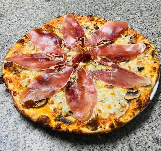 Sauce tomate, champignons frais, jambon cru, roquefort, mozzarella
